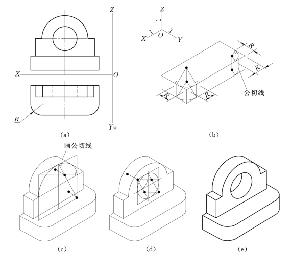 (a)视图;(b)画底板,先画长方体,然后画圆角;(c)准确定位画直立板;(d)画直立板上圆孔;(e)检查,加深,完成作图