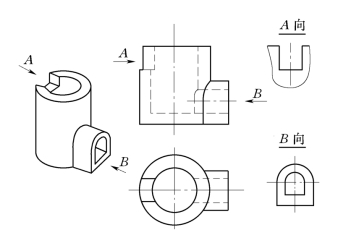 (3)局部视图应尽量配置在箭头所指的方向,并与基本视图保持投影关系。由于布局等原因,也允许把局部视图配置在图幅其他适当的地方,如图B向视图。