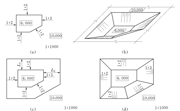 【例8-2】 已知地面高程为10m,基坑底面高程为6m,坑底的大小形状和各坡面坡度如图8-1l(a)所示,完成基坑开挖后的标高投影图。