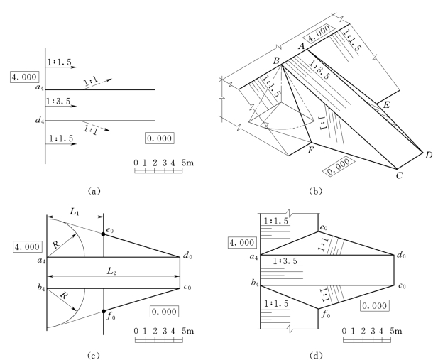 (1)求坡脚线。平台坡面的坡脚线和斜坡道的坡脚线的求法是:已知各坡面上高程为4m的等高线,坡脚线是各坡面上高程为0m的等高线,高差为4m,由此可求出其水平距离L 1=1.5×4=6m、L 2=3.5×4=14m,根据所求的水平距离,按比例沿各坡面坡度线分别量得各坡面上的0m高程点,作坡面上已知等高线的平行线即得。斜坡道两侧坡脚线的求法是:分别以a 4、b 4为圆心,以R=1×4=4m为半径画圆弧,再由c 0、d 0向两圆弧作切线,即得斜坡道两侧的坡脚线,如图8-12(c)所示。