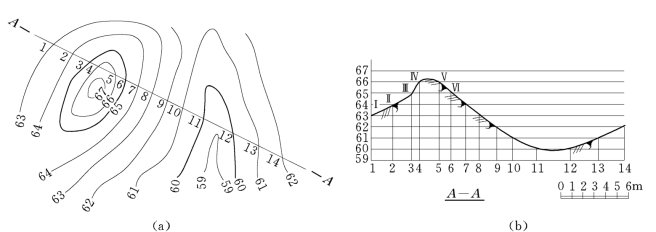 用一铅垂面剖切地形面,画出剖切平面与地形面的交线及剖面符号,称为地形断面图。如图8-24(a)所示,剖切平面A-A与地形面相交,剖切面与各等高线的交点为1、2、3、…、14。地形断面图作图方法如图8-24(b)所示,以水平距离为横坐标、高程为纵坐标作直角坐标系,根据地形图上的高差,按图示比例将高程标在纵坐标轴上,并画出一组水平线,如图中的59、60、…,根据地形图中剖切平面与等高线各交点的水平距离,在横坐标轴上标出1、2、3、…、14各点,然后自点1、2、3、…、14作铅垂线,与相应的水平线相交得I、Ⅱ、Ⅲ、…,依次光滑连接各点,即得该断面实形,再画出剖面符号。