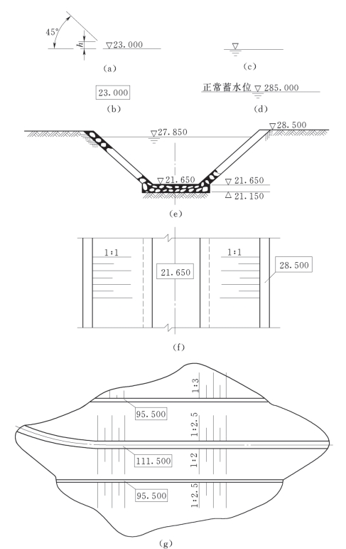 (3)水面标高(水位)的注法。水面标高的注法与立面图中注标高相类似,区别在于需在水面线下画三条渐短的细实线,如图9-16(e)中的标高尺寸“27.850”。特征水位应在标注水位的基础上加注特征水位名称,如图9-16(d)中的“正常蓄水位”。