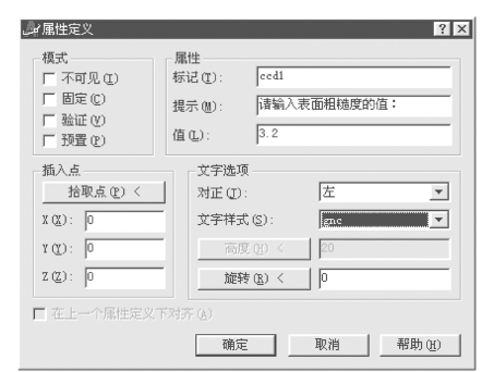 ATTDEF(弹出如图11-29所示的“属性定义”对话框,并按图中的实例完成其中的空白,这里需要说明的是,对话框中的文字样式“gnc”是预先设置好的,然后点击“拾取点”按钮)