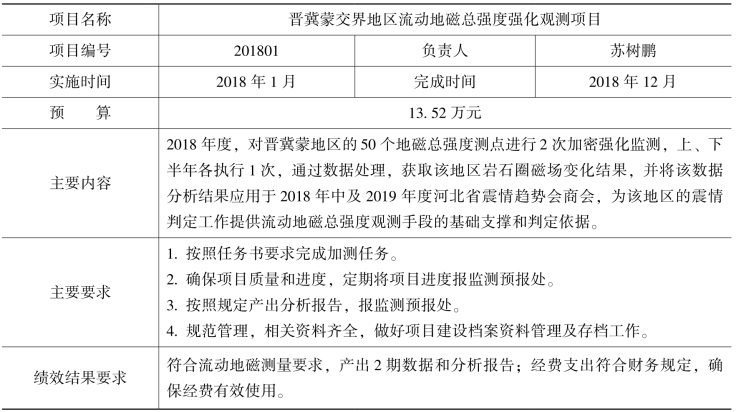 根据2018年度震情跟踪工作安排,更好地为地震预测预报提供技术支撑,经研究决定对晋冀蒙交界地区进行流动地磁总强度强化观测,现将项目任务书下达给你们,此项目经费13.52万元,请认真组织,合理安排,专款专用,规范管理,加快项目执行,提高经费使用效益,确保项目顺利实施。