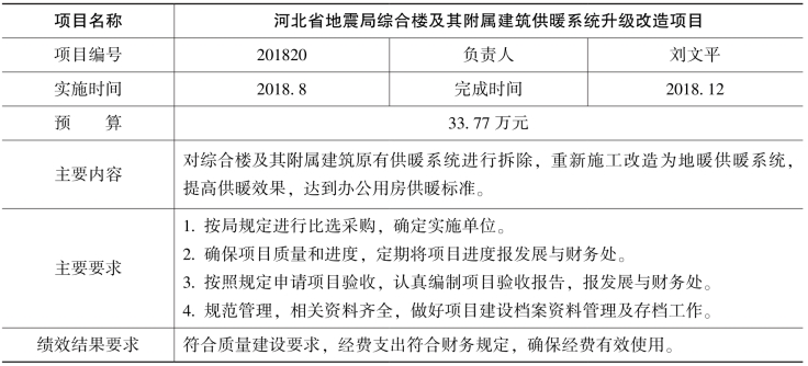 经局领导研究批准,现将河北省地震局综合楼及其附属建筑供暖系统升级改造项目任务书下达给你单位。请你单位认真组织,合理安排,专款专用,规范建设,加快项目执行,提高经费使用效益,确保项目顺利实施。