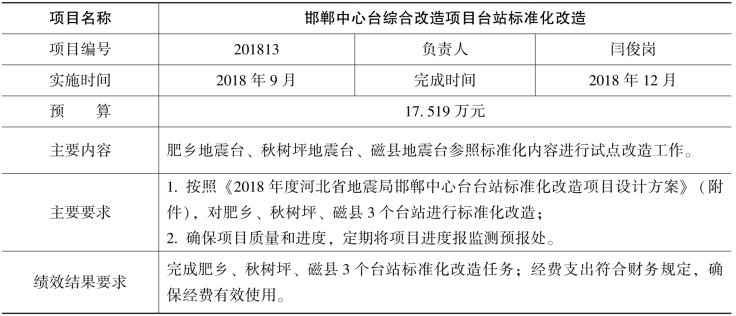 根据《关于批复河北局等单位2018年度台站综合观测技术保障系统项目实施方案的函》(中震测函〔2018〕13号)、《地震台站标准化内部规范设计图册(试行稿)》和《中国地震局SI空间识别系统(试行稿)》文件要求,监测预报处组织相关人员编写了《2018年度河北省地震局邯郸中心台台站标准化改造项目设计方案》(详见附件),现将邯郸中心台综合改造项目所含台站标准化改造任务书下达,请你单位认真组织,合理安排,专款专用,加快项目执行,提高经费使用效益,确保项目顺利实施。