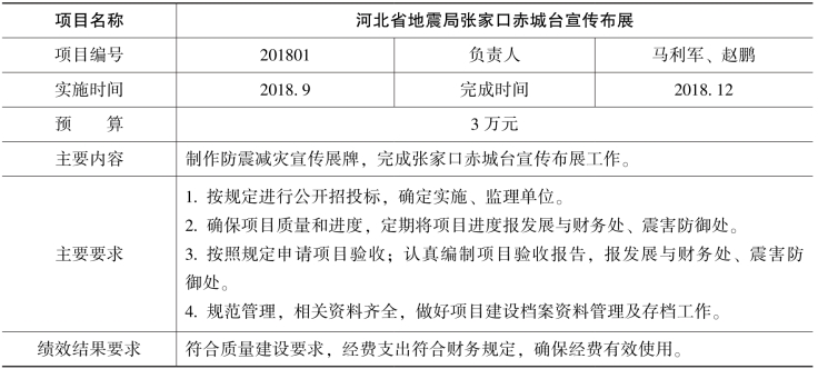 为贯彻落实应急管理部、教育部、科技部、中国科协和中国地震局《加强新时代防震减灾科普工作的意见》(应急〔2018〕57号)要求,强化防震减灾科普阵地建设,推进地震台站发挥防震减灾宣传作用,长效开展防震减灾宣传活动,现拨付专项经费3万元用于张家口赤城台防震减灾宣传布展,请专款专用,于年底前做好布展工作。