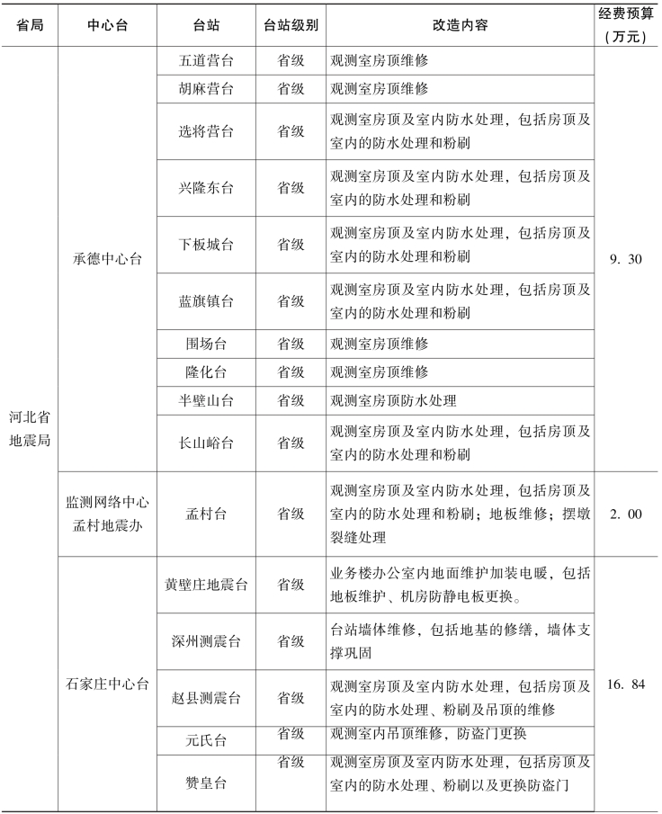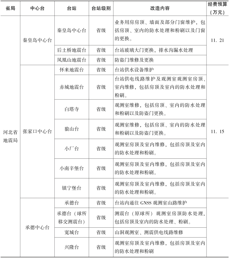 对2018年因暴雨、冰冻等极端天气致损的秦皇岛中心台、后土桥地震台、凤凰山地震台、怀来地震台、白塔寺台、赤城台、狼山台、小厂台、小南辛堡台、镇宁堡台、承德地震台、宽城地震台、兴隆台、五道营台、胡麻营台、选将营台、兴隆东台、下板城台、蓝旗镇台、围场台、隆化台、半壁山台、长山峪台、黄壁庄地震台、深州地震台、赵县台、元氏台、赞皇台基础设施进行修缮。对室内墙壁进行防水粉刷,对台站房顶进行防水处理和修缮,对部分台站内道路进行修复,对部分台站供水、供电线路进行整修等,保证恢复台站正常观测。