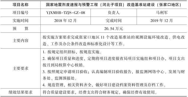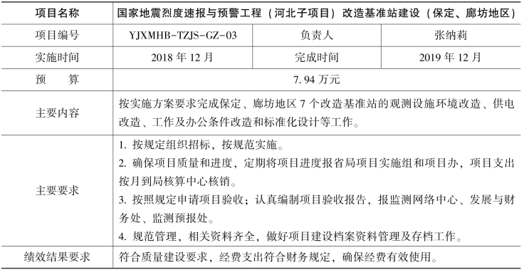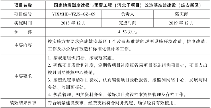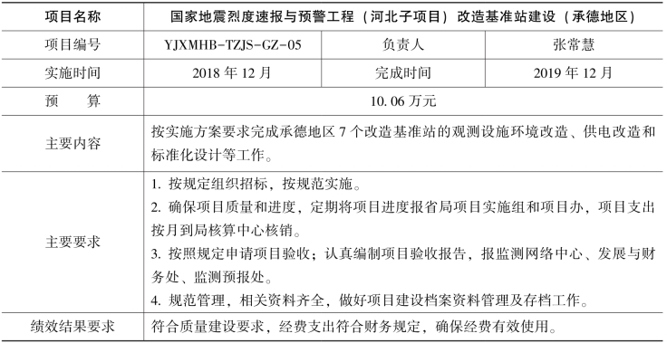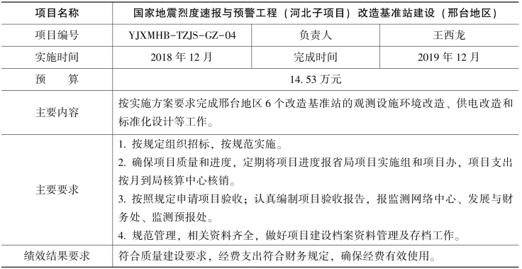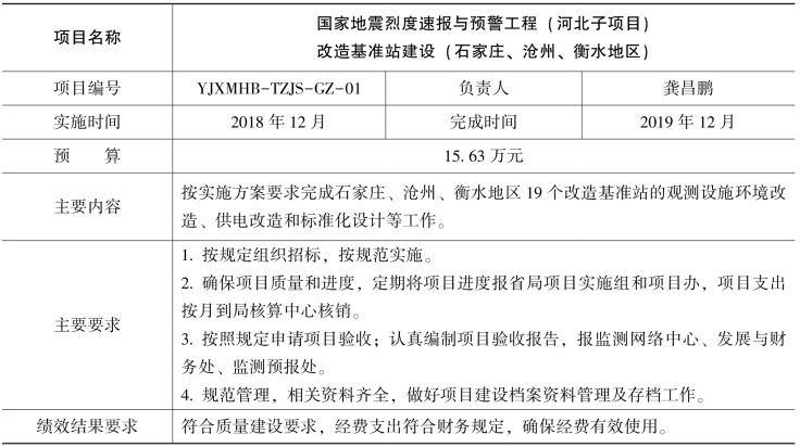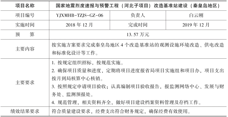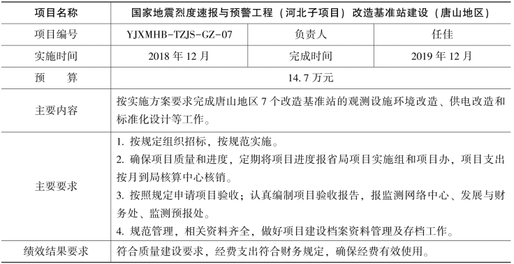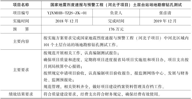 根据国家地震烈度速报与预警工程(河北子项目)工作安排,经研究决定开展改造基准站建设和土层台站场地勘察钻孔测试工作,现将项目任务书下达给你们,请认真组织,合理安排,专款专用,规范管理,加快项目执行,提高经费使用效益,确保项目顺利实施。