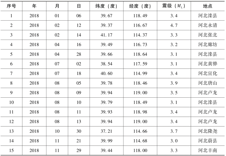 2018年河北及京津地区共发生ML1.0~1.9级地震759次,ML2.0~2.9级地震140次,ML3.0~3.9级地震14次,ML4.0~4.9级地震1次,最大地震为2018年2月12日河北永清ML4.8级地震。地震活动频次和强度均高于上一年度。地震活动主要分布在张渤带和河北平原带。自1980年以来河北省及京津地区ML≥3.0地震年频次约为30次,本年度河北省及京津地区ML≥3.0级地震活动频次是15次,地震活动处于较低水平。