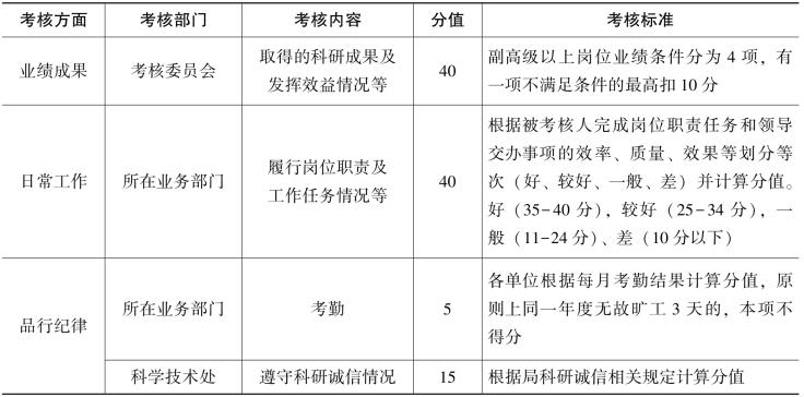 第五条 业绩成果的考核以不同专业技术岗位层次(正高级岗位、副高级岗位、中级岗位、初级岗位)所对应的业绩条件为主要依据(详见附件1),日常工作的考核以各用人单位对被考核人的履职尽责情况的评价为主要依据,品行纪律的考核则以被考核人的出勤情况,以及是否存在违反科研诚信和违法乱纪行为等为主要依据。