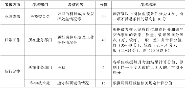第五条 业绩成果的考核以不同专业技术岗位层次(正高级岗位、副高级岗位、中级岗位、初级岗位)所对应的业绩条件为主要依据(详见附件1),日常工作的考核以各用人单位对被考核人的履职尽责情况的评价为主要依据,品行纪律的考核则以被考核人的出勤情况,以及是否存在违反科研诚信和违法乱纪行为等为主要依据。