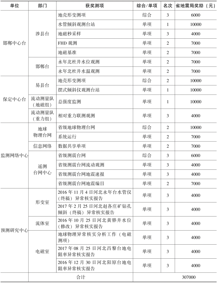 根据中国地震局《关于通报2017年度地震监测预报工作质量评估结果的函》(中震测函〔2018〕77号),在全国2017年度地震监测预报工作质量评比中,我省参评项目有164项,参评优秀率100%,获得学科综合评比和单项评比前三名共50项。依据《河北省地震局监测预报评比奖惩办法》和绩效工资管理的有关规定,分别对获得前三名的单位予以奖励。