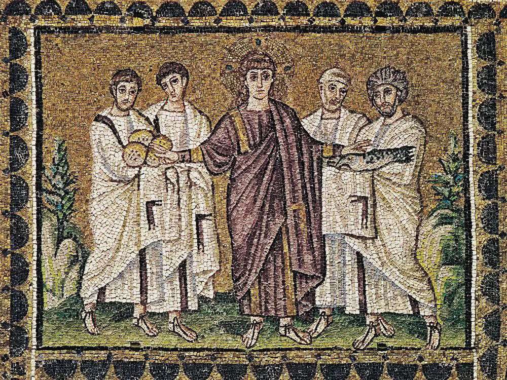 《面包和鱼的奇迹》就属于典型的基督教艺术。画面描述的是《圣经》中的一个故事,耶稣和门徒路过一个贫穷的地方,看到人们都很饥饿,耶稣大发慈悲,把五张饼和两条鱼变成很多食物,分给了五千人。