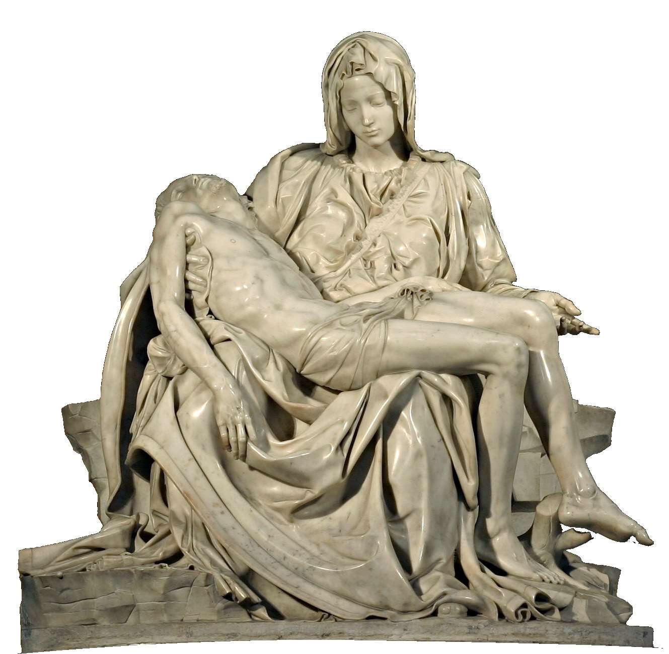 雕像中的圣母是一个典雅端庄的少女,她平静地俯视着死去的儿子耶稣。耶稣脸上没有任何痛苦的表情,静静地横躺在母亲怀里,右手无力地垂着,头向后仰着,表现出死亡的虚弱与无力。
