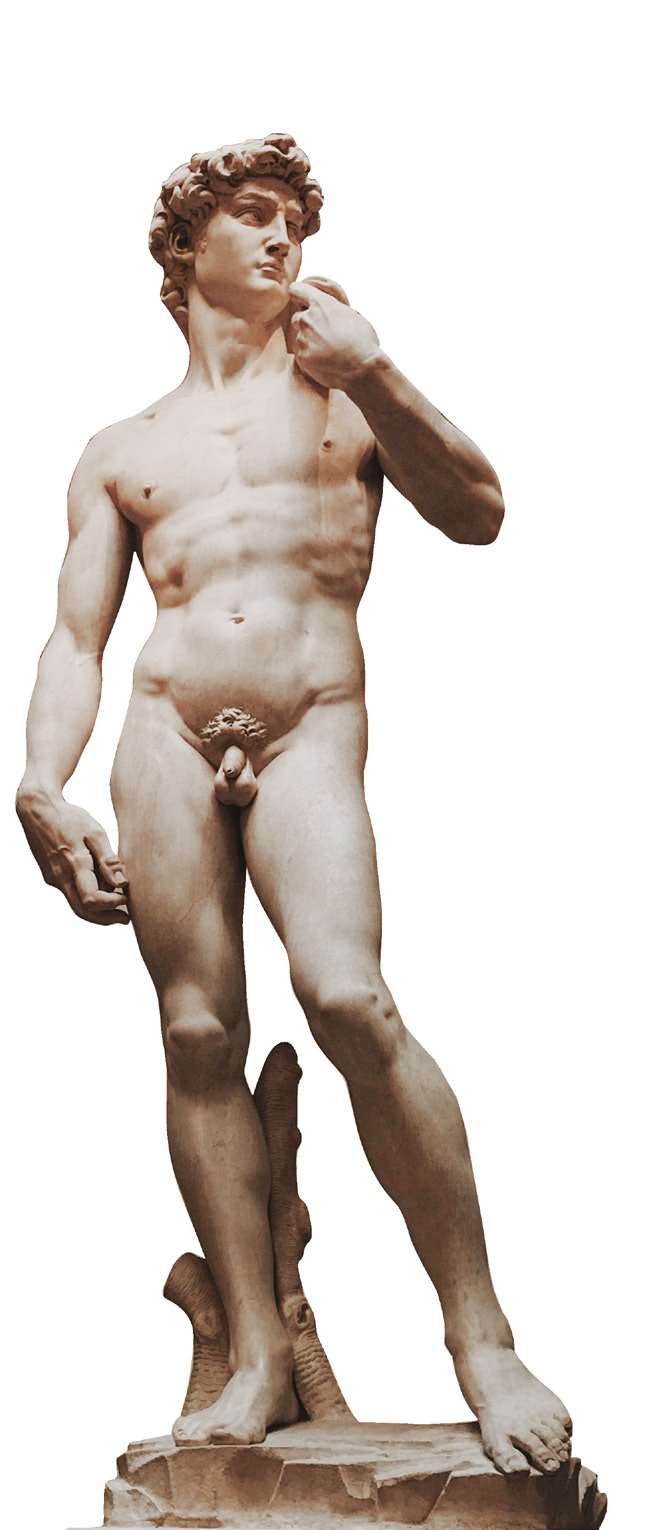 大卫这一人物形象来源于《圣经》,是一位保家卫国的英雄。米开朗基罗用雕塑表现了大卫迎战前的状态——他举起左手,紧握肩上的“甩石带”,右手好似将要握拳,他的眼神专注地看着前方的战场,显得无畏而肃穆。大卫整体的姿态和神情都充满了力量,淋漓尽致地体现了战士在上战场前的英勇坚定和顽强。