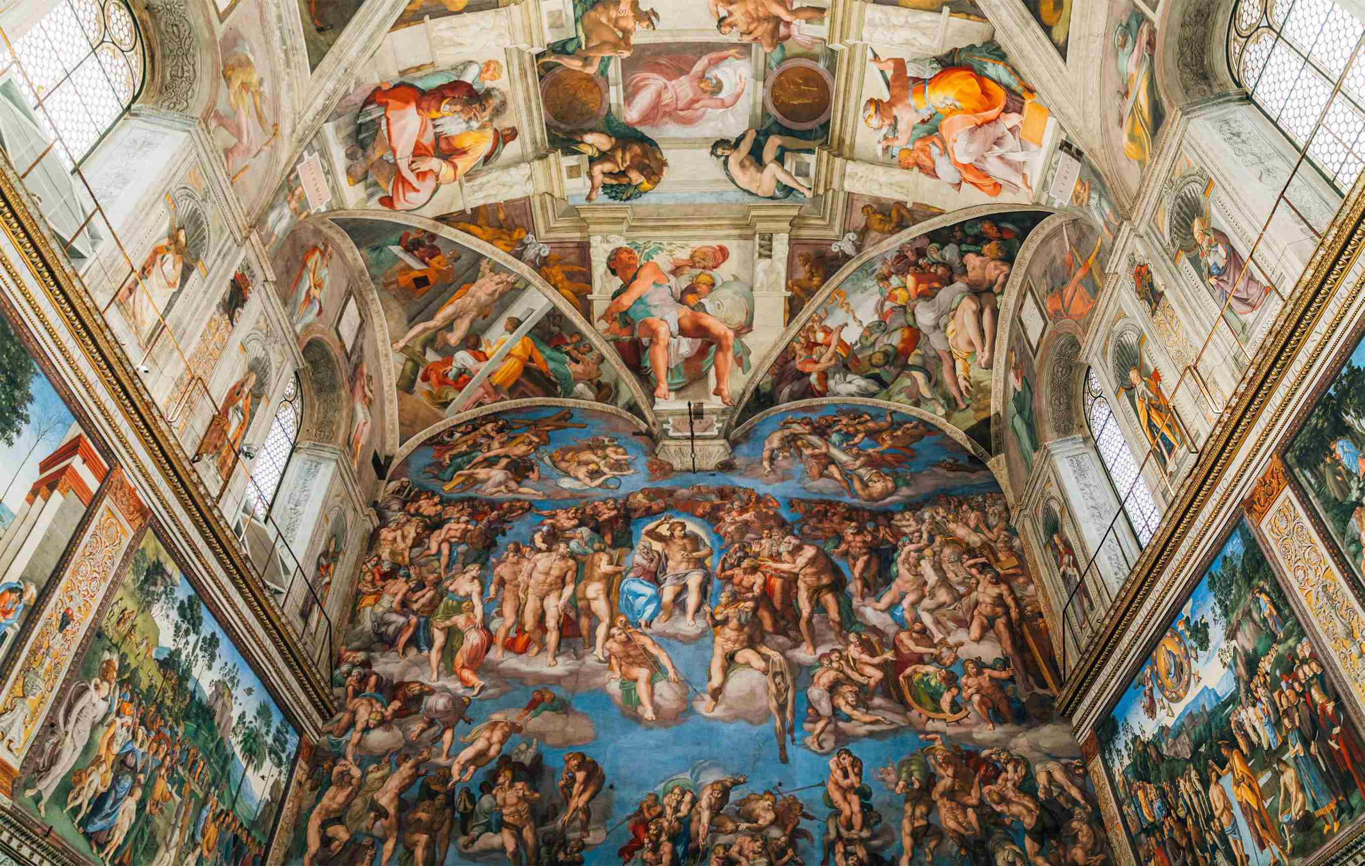 起初他请了一些画家帮忙,后来他对这些助手的工作并不满意,就把他们打发走了。于是,从构图到上色,全部的绘画工作都是由米开朗基罗一人完成的。