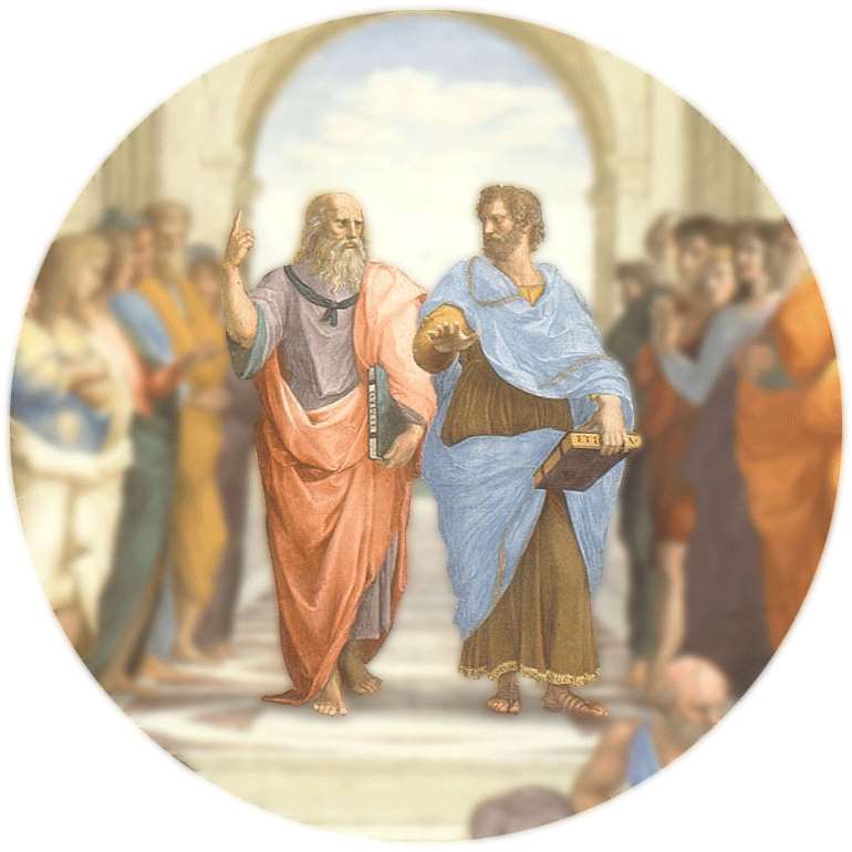 《雅典学院》取材于公元前 4 世纪古希腊哲学家柏拉图举办雅典学院的逸事。整个画作以拱形圆屋顶作为背景,把来自不同时期、不同地域、不同领域的五十多位学者集中到一个空间,正中间的这两个人,分别是柏拉图和亚里士多德。