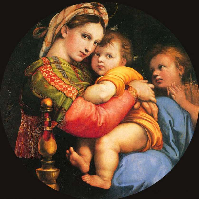 拉斐尔的另一幅圣母像也非常有名,叫《椅中圣母》。画中圣母坐在椅中,双臂搂着耶稣,头部温柔地贴着耶稣的前额,眼神中流露出深沉的母爱。整幅画从圆形外框到人物的组合、体态、衣着、褶纹都采用了圆形构图,给人一种丰满、柔和与和谐的画面。