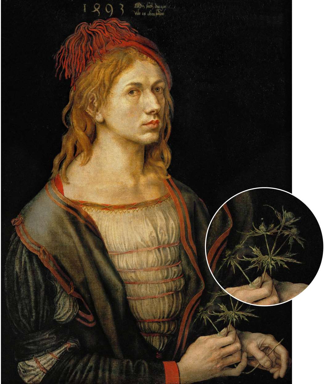 下面这幅是丢勒22岁时的自画像,在这幅肖像油画中,丢勒将自己描绘成一个成熟、坚毅的男人,头上戴着一顶小红帽,手里拿着一株草——刺芹。这种草在西方象征着爱情。