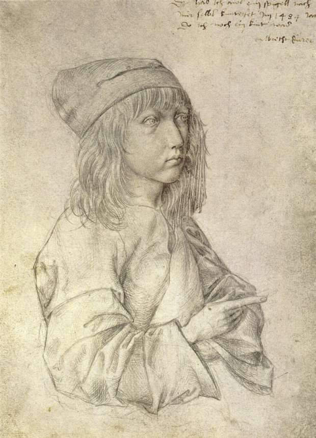 丢勒出生于一个金银匠世家,从小就接受雕刻和绘画技法的训练。13 岁时,丢勒用银针笔为自己画了一幅肖像,并在画上写道:“1484年,当我还是一个孩子的时候,我照着镜子画了自己。”