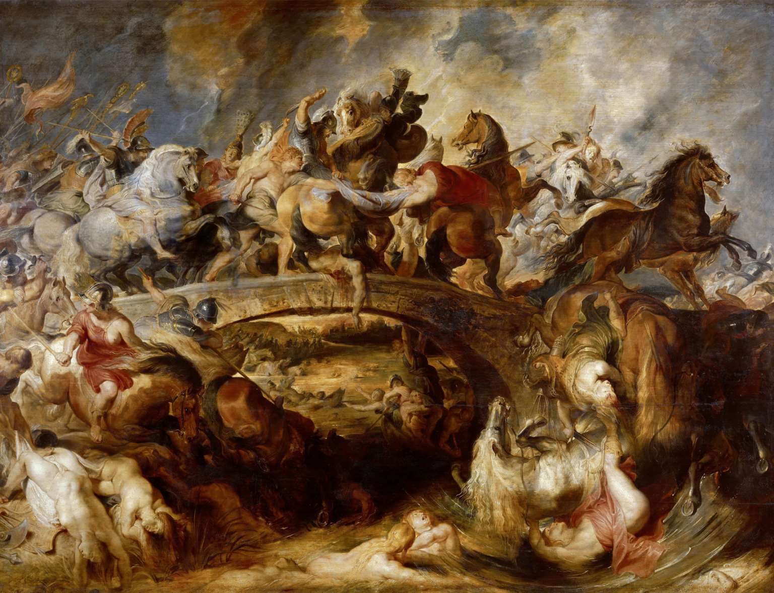 战争发生在桥上,双方为了争夺这座桥,展开了一场激烈的较量。右边脱缰狂奔的战马及滚落河中的亚马逊战士,给人强烈的运动感。饱满鲜明的色彩,塑造了人物真挚的感情。