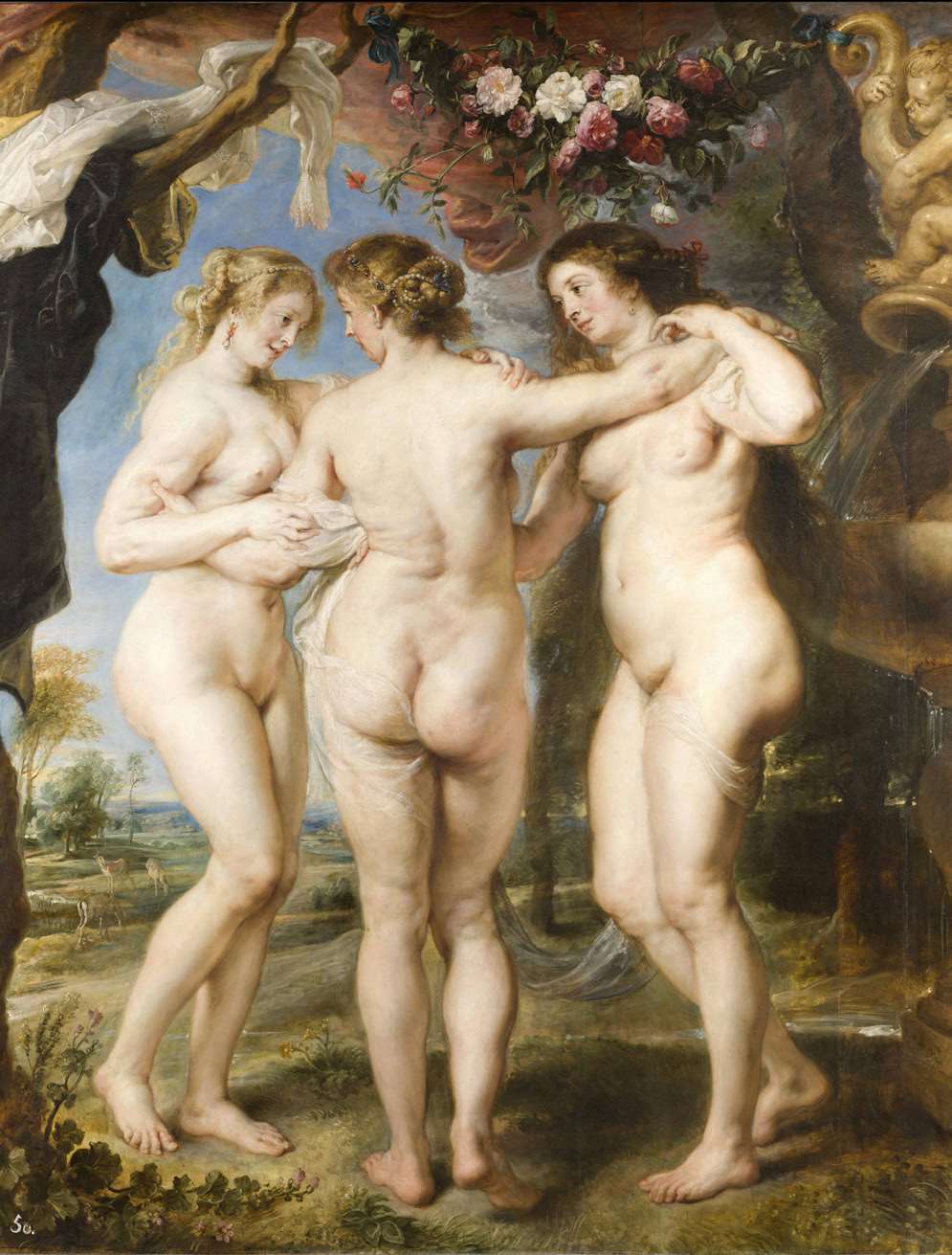 下面这幅《美惠三女神》油画,三位女神身体健硕、丰满,充满生命力,色调浓烈,线条流畅,体现了佛兰德斯平民社会富裕欢快的气息。