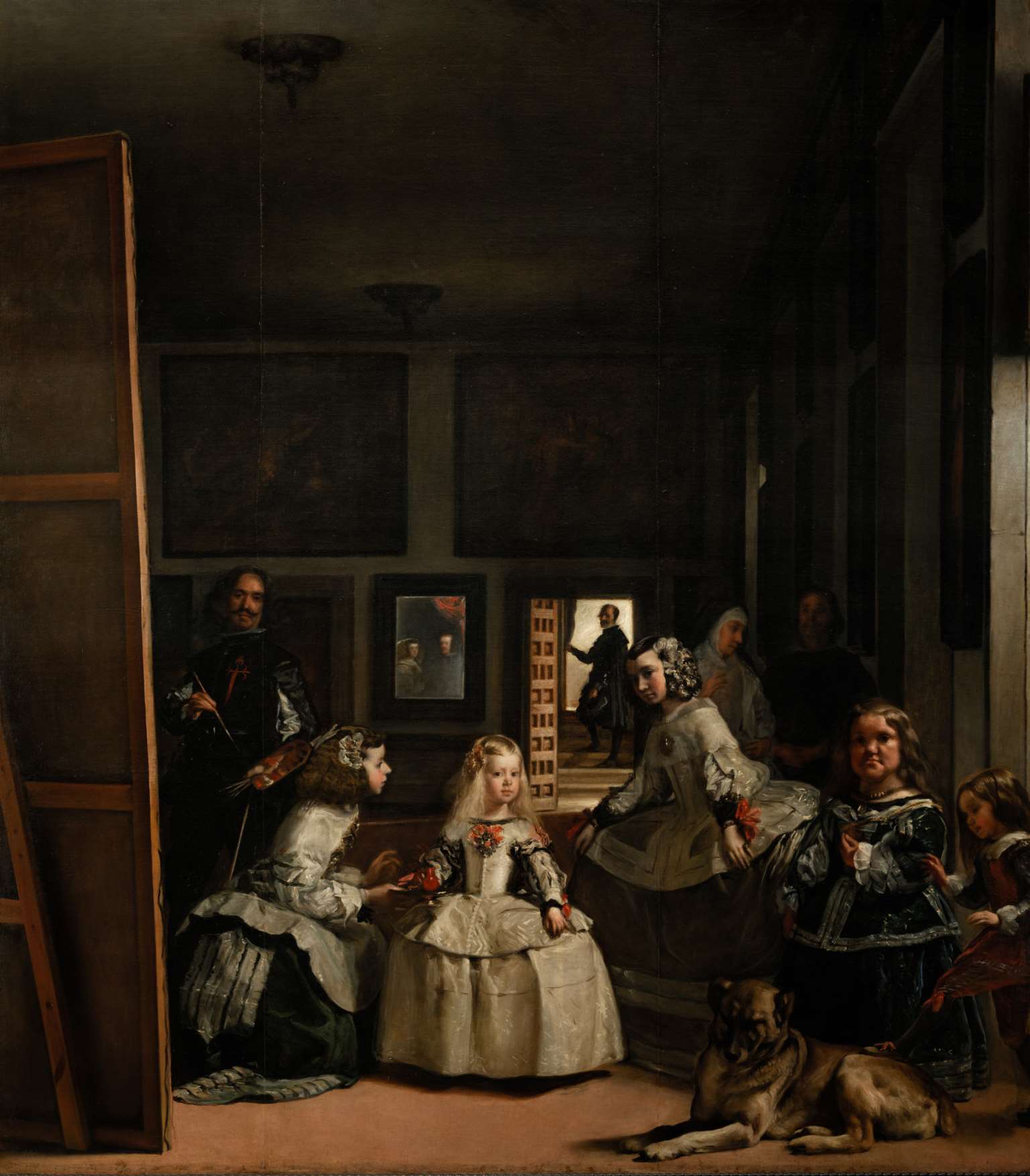 画面中心是主角特蕾莎公主,她的身边围绕着宫娥、矮人和一干随从;画面左侧有一个巨大的画板,还有正在作画的画家本人;特蕾莎公主后面的墙上有一面镜子,透过镜子反射出来的人物正是西班牙国王腓力四世和王后玛丽安娜。