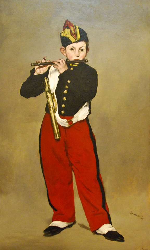 我们先来看看马奈的著名作品《吹笛少年》,这是一幅很简单的画作,它描绘的是卫军乐队里一位少年士兵正在吹短笛的场景。