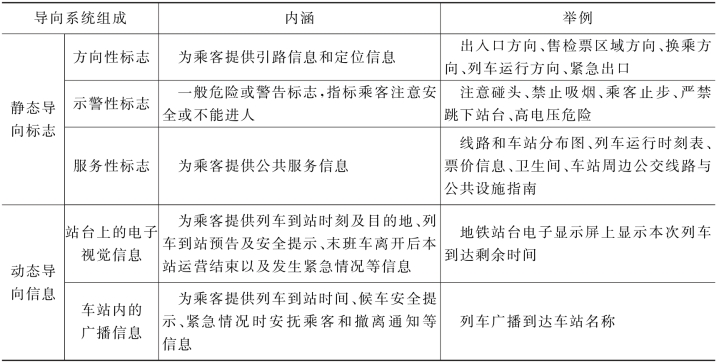 乘客导向系统由设置在车站外、出入口、通道、站厅、站台和车辆等处,包括图形、文字、符号和数字在内的各种静态导向标志,以及实时发布的视觉和听觉导向信息组成。具体可分为静态导向标志和动态导向信息。动态导向信息,即实时发布的导向信息,是静态导向标志的补充。按基本功能和媒介形式的不同,它们又可分为若干类型,具体见表1-2所示。