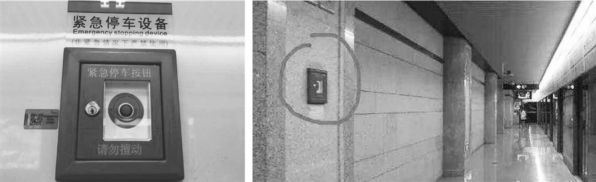 紧急停车按钮是一个红色塑料盒子,上面标示有“紧急停车按钮,非紧急情况下禁止使用”,一般被安置在站台上对着地铁屏蔽门的柱子或墙壁上,如图1-11所示。