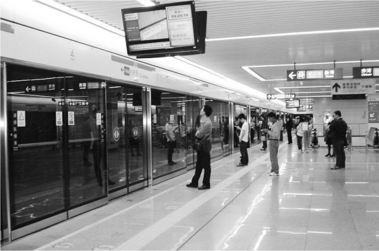 站台是车站的重要组成部分如图2-5所示,在早晚客流高峰期,站台秩序容易混乱,有可能引发安全事故,工作人员与乘客之间也容易发生纠纷,其服务的水平直接影响车站的服务质量。安全员主要负责监控站台乘客乘降情况,监控列车运行情况,播放或人工进行站台广播,解答乘客疑问,对乘客安全和秩序行维护、问询等工作。