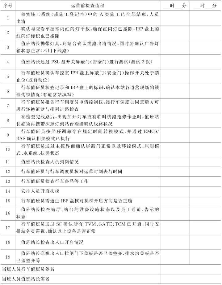 3)查阅上一班的《施工登记本》《施工清销点情况控制表》《车站运营前检查工作流程表》(见表2-2)、《设备设施故障登记本》(包括AFC故障报修记录)等,了解清楚上一班的情况。