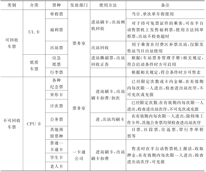 在城市轨道交通系统中所使用的车票种类较多。根据车票是否由闸机回收,车票可分为可回收车票和不可回收车票。可回收车票包括单程票、福利票和出站票等,不可回收车票包括各种纪念票、公务票等。表4-1列出了车票的类别及其使用方法。