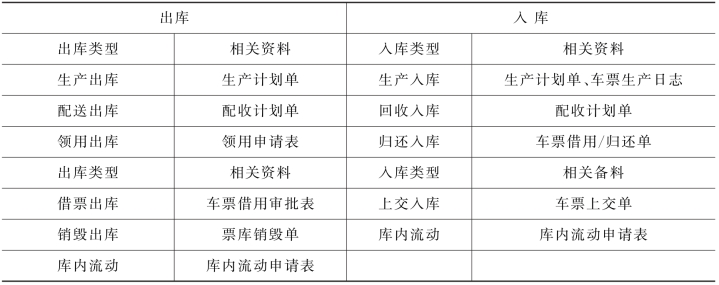 ①车票出入库类型。车票出库类型包括生产出库、配送出库、领用出库、借票出库、销毁出库、库内流动等。车票入库类型包括生产入库、回收入库、归还入库、上交入库、库内流动等。