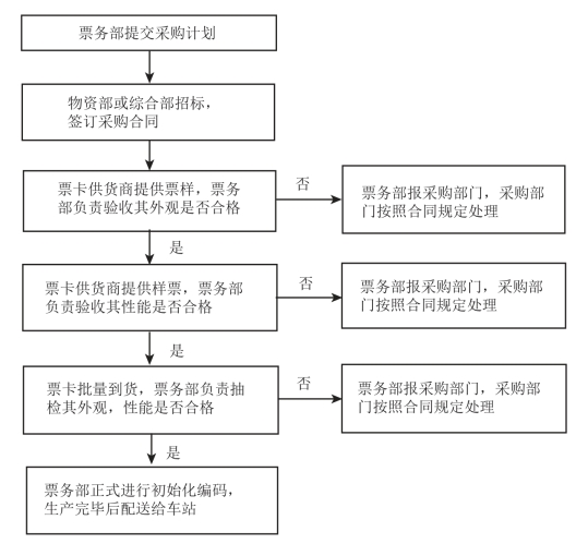 车票的作业流程大体为:车票发行→车票采购→车票验收→车票制作→车票出入库→车票配送→车票回收。