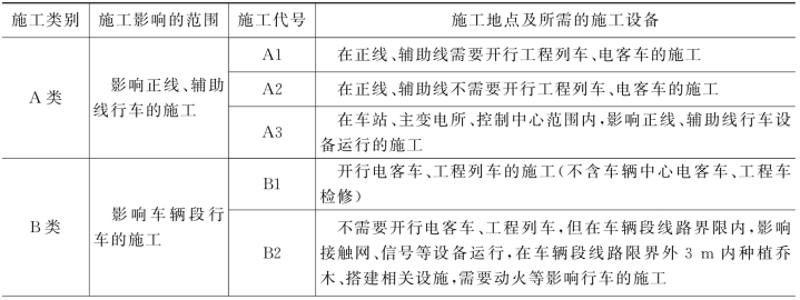 施工计划按施工地点和影响范围不同可以分为三类,包括A类、B类、C类,具体的分类标准如表6-1所示。说明:
