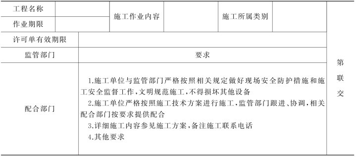 (1)外单位须按照《外单位施工进场管理规定》办理《外单位施工作业许可单》,如表6-3所示。外单位名称:工程负责人: