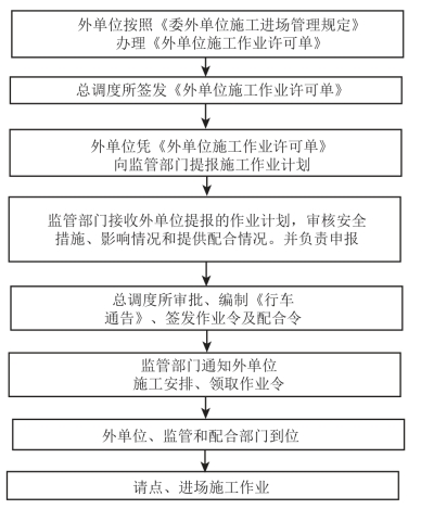 (5)外单位施工作业基本流程是外单位先按有关规定办理《外单位施工作业许可单》,之后凭借已签发的《外单位施工作业许可单》申报施工计划,经相关部门审批并发放作业令后,外单位配合监管部门等进场进行施工作业,如图6-1所示。