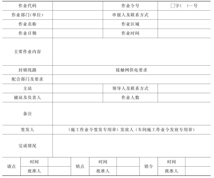 在运营公司管辖范围内,任何施工部门、单位都必须持有《施工作业令》(见表6-5),才可进场作业。施工作业令上写明了作业代码、作业部门、作业日期、作业区域等施工作业信息。