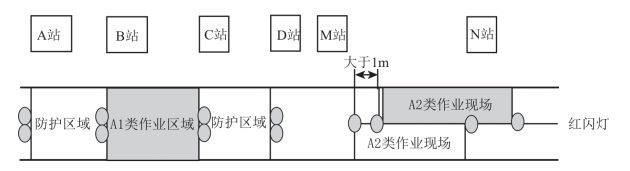 (2)A2类施工作业的施工过程中施工人员须在作业现场两端的轨道中央各设置一盏红闪灯,遇多个作业需在同一地段设置红闪灯时,相邻两个红闪灯之间应至少保持1 m以上的距离。