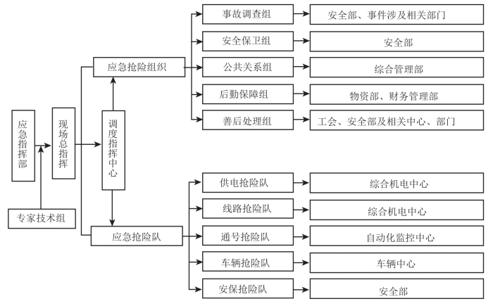 应急救援组织机构的组织形式是在应急指挥部的领导下,由各中心、部门按相应职责及分工开展应急救援活动,以保证地铁运营事故应急救援快速、高效、有序。