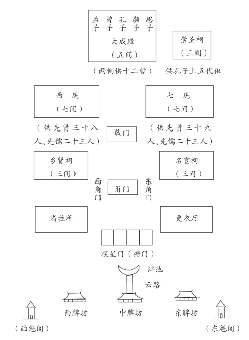 大成殿和东、西庑之南为戟门,有房三间。戟门再南,东院为名宦祠,西院为乡贤祠,各有房三间。二祠之南,又有甬门一道,并分为东、西角门,各有房一间。出角门,东侧为更衣厅,西侧为省牲所,各有房三间。再南向为棂星门,上悬匾额并书“道冠古今”四字。门前有沣池与环墙。再南向经云路、照墙栅门和中(上书“金声玉振”)、东(上书“圣域”)、西(上书“贤关”)三座牌坊,即走出孔庙大门。