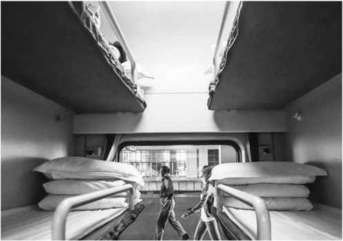 Hard Sleeper(硬卧),is the basic accommodation for an overnight train.Despite the name,the bunks comfortably accommodate anyone below six feet.Three bunks are arranged on a side in a compartment—indicated by top,middle and bottom on the ticket.There are no doors for the compartments.As the compartments lack doors,it is hard to have a good sleep due to continuous snores,kids'crying and the sound of the train moving.The fare is about twice as much as a hard seat.