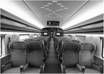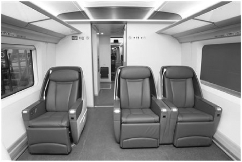 Business Class Seat(商务座),on a few services pending on train types,such as the CRH380AL or CRH380BL trains.C,D or G train business class seats are the equivalent to the first-class on an airplane and are only available on G and some D types.There are two sofa-like seats on one side and one on the other side.The seats can be adjusted flat for passengers to lie down.The fare is the highest—about twice that of the first-class seat.