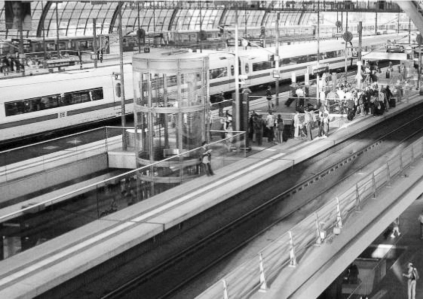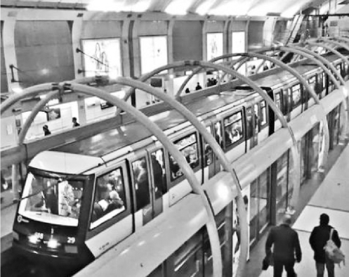 20世纪50—70年代,法国将领先于世界的磁卡技术运用到地铁上,1973年自动检票机投入使用,1975年地铁磁卡月票问世。1969年,快线地铁正式通车。这种位于地下深处、介于普通地铁和火车之间的交通工具开往巴黎远郊,又和市区地铁紧密衔接。1998年开通的14号线,向人们展示了新世纪地铁的形象:通体无阻隔车厢,无人驾驶、更安全的站台玻璃隔墙,更宽阔、更敞亮的转乘通道,更富有人情味的地下绿化环境。巴黎地铁车站如图1-5所示。