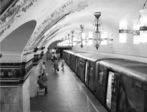 莫斯科地铁于1935年正式开通,是世界上规模最大的地下线路系统之一。莫斯科地铁布局与地面的布局一致,呈辐射及环行线路。地铁总共有12条线,包括11条辐射线和1条环行线。所有的线路按照其开通顺序的先后获得1—12的编号,其中最重要的线路便是长度大约为20公里的5号线——环线,它负责连接起其余绝大部分分支线路。莫斯科地铁车站如图1-9所示。