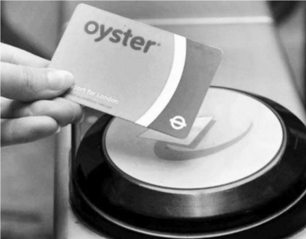 伦敦地铁内有售票窗口及自动售票机,可以使用借记卡、信用卡、硬币和纸币。伦敦地铁为自动检票,将票面向上插入检票口的检票机侧面一个缝隙中,票即被自动送入,并从检票机上方弹出。拔出票,检票口栏杆自动打开,人过去后栏杆合上。现在大部分人使用oyster卡,可用于地铁和大部分公共汽车,只需将卡靠近地铁检票口的黄色圆盘,如图1-2所示。如果卡内已经充值了为有效车票,栏杆会自动打开;如果出现故障,可以持票向站内工作人员咨询。