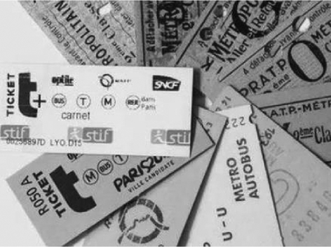 巴黎地铁线路繁多,100多年来巴黎地铁将整个路网划分为几个区域,在城市中心区的几个区域里采用自动售检票系统。巴黎地铁的票务系统充分考虑了乘客的多种需求,车票媒介为小型纸质磁卡,有单张票、本票(十张票)、日票、两日票、三日票、五日票、周票、月票、年票和观光票等多种车票类别,如图1-6所示。此外,针对儿童、学生等,还设置了不同的票种。单程票采用计时单一票价,车票具有有效时间,跨区域乘坐需要重新购票。