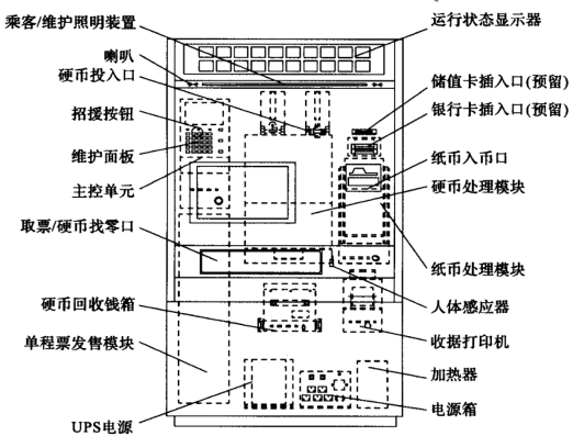 自动售票机一般由主控单元(也称为工控机)、纸币处理模块、硬币处理模块、维护面板、电源箱、收据打印机等,如图3-5所示。